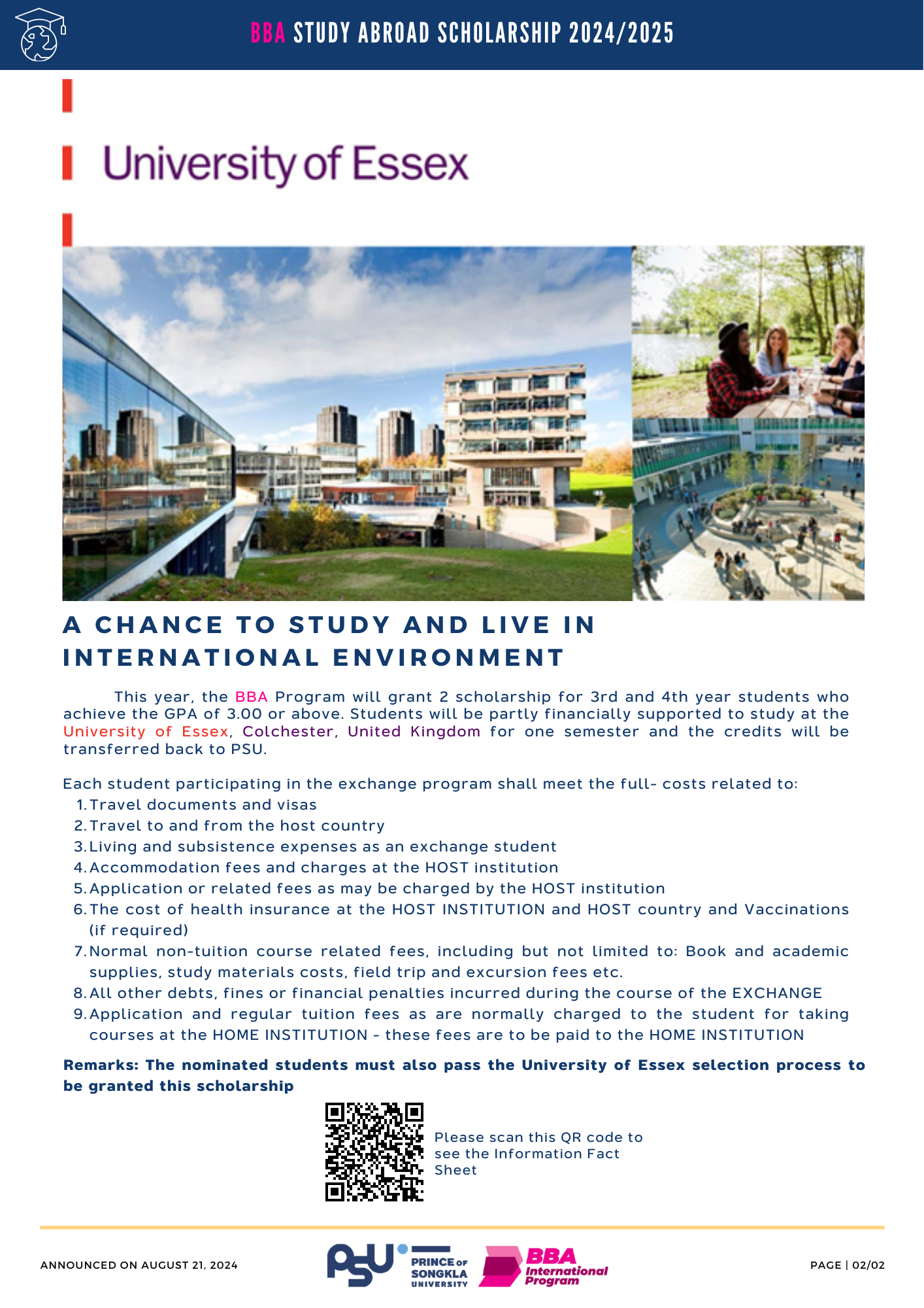 This year, the BBA Program will grant 2 scholarship for 3rd and 4th year students who achieve the GPA of 3.00 or above. Students will be partly financially supported to study at the University of Essex, Colchester, United Kingdom for one semester and the credits will be transferred back to PSU.