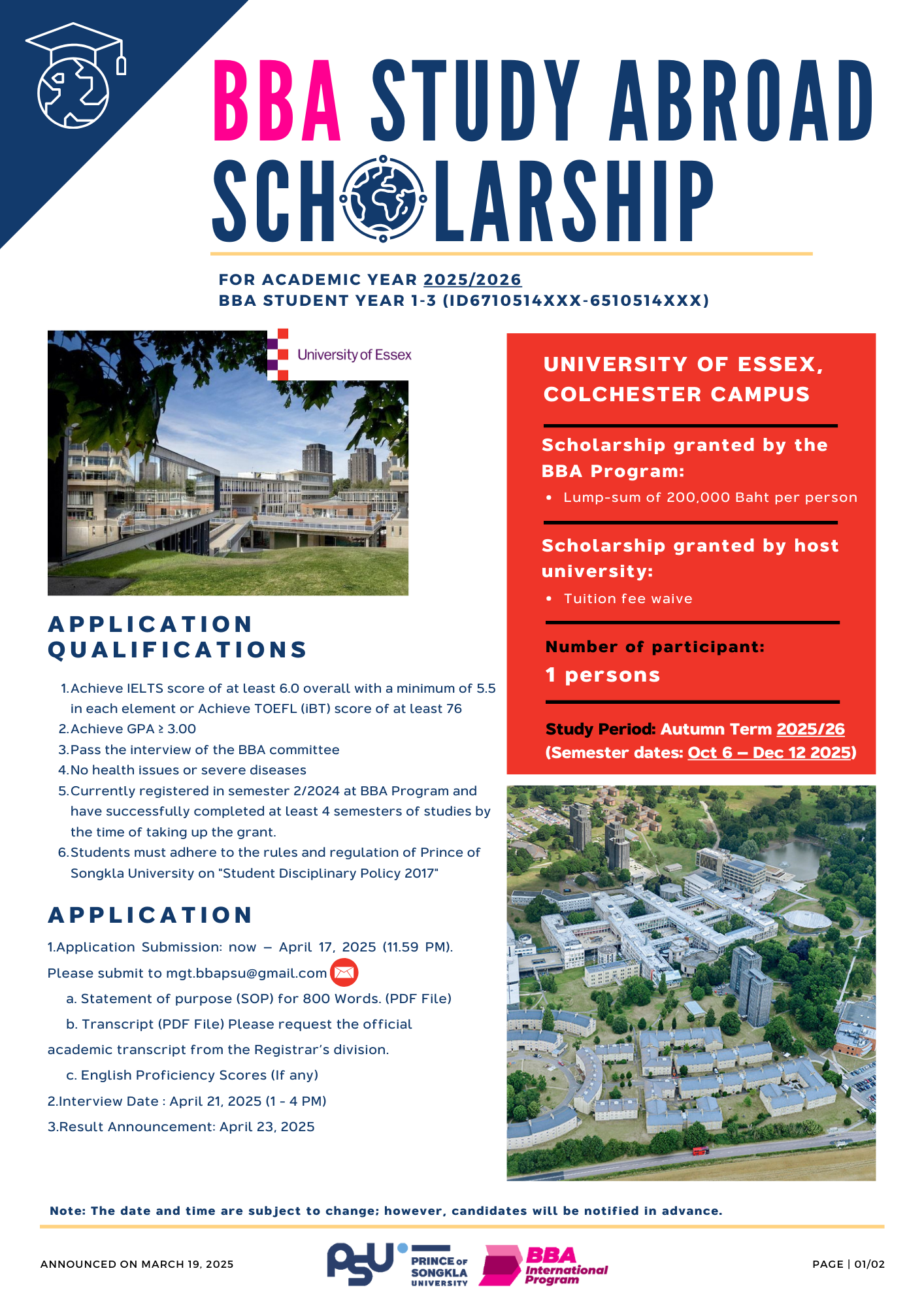 This year, the BBA Program will grant 1 scholarship for 1-3 year students who achieve the GPA of 3.00 or above. Students will be partly financially supported to study at the University of Essex, Colchester, United Kingdom for one semester and the credits will be transferred back to PSU.