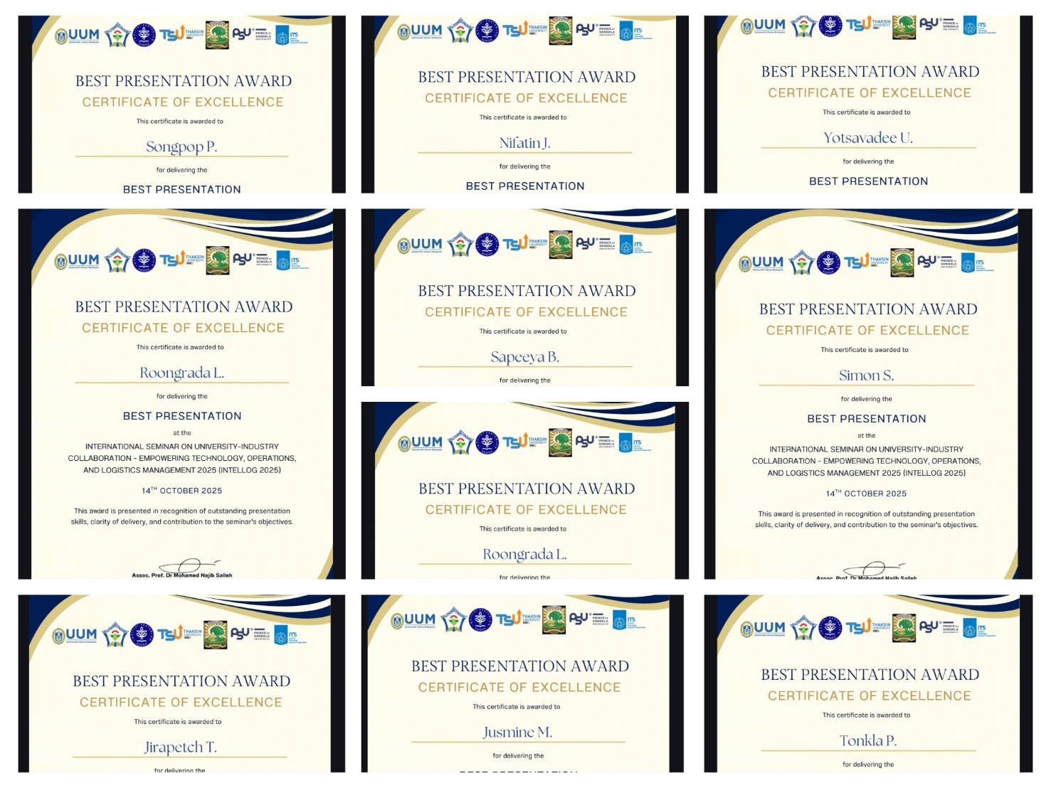 On 14 October 2025, our outstanding BBA (International) students achieved the Best Presentation Award—Certificate of Excellence at the International Seminar on University–Industry Collaboration – Empowering Technology, Operations, and Logistics Management 2025 (INTELLOG 2025), organized by the School of Technology Management and Logistics, Universiti Utara Malaysia (UUM),